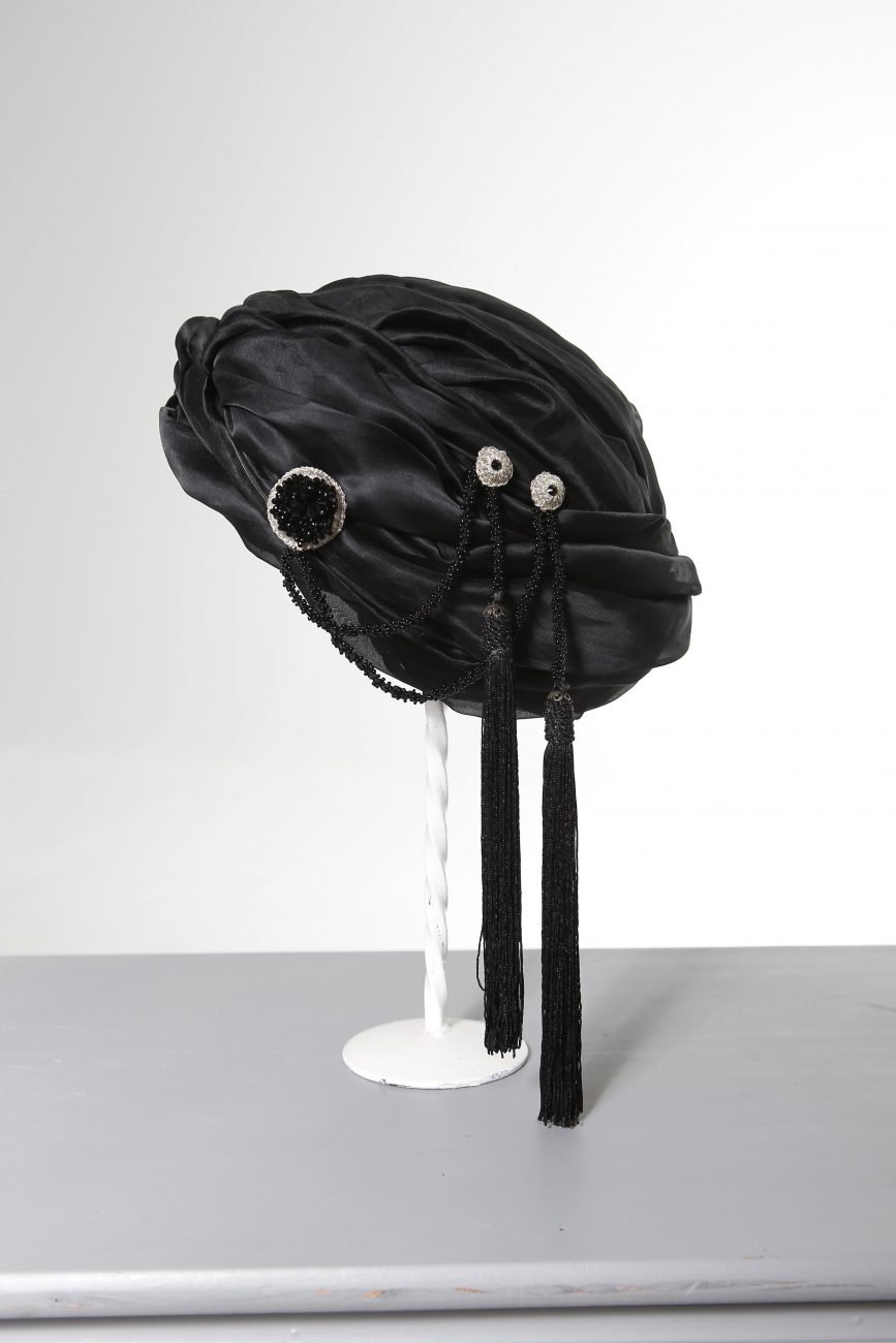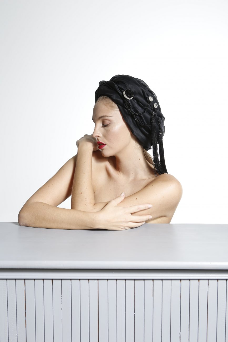 Hand-made turban with felt base, with pleated fabric in black or bone white, adorned with lace and tasselled fringe.