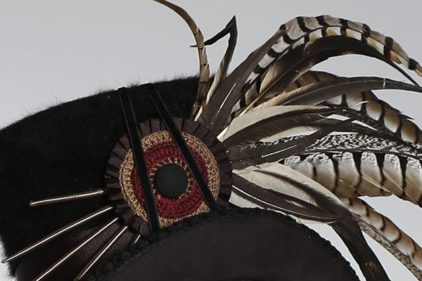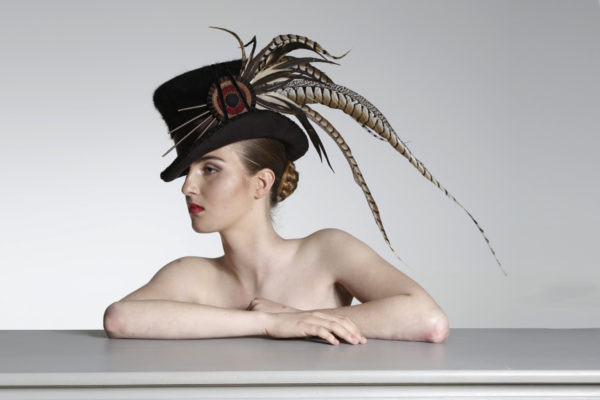Hand made top hat lined in Angora wool, adorned with long pheasant feathers and a cockade.