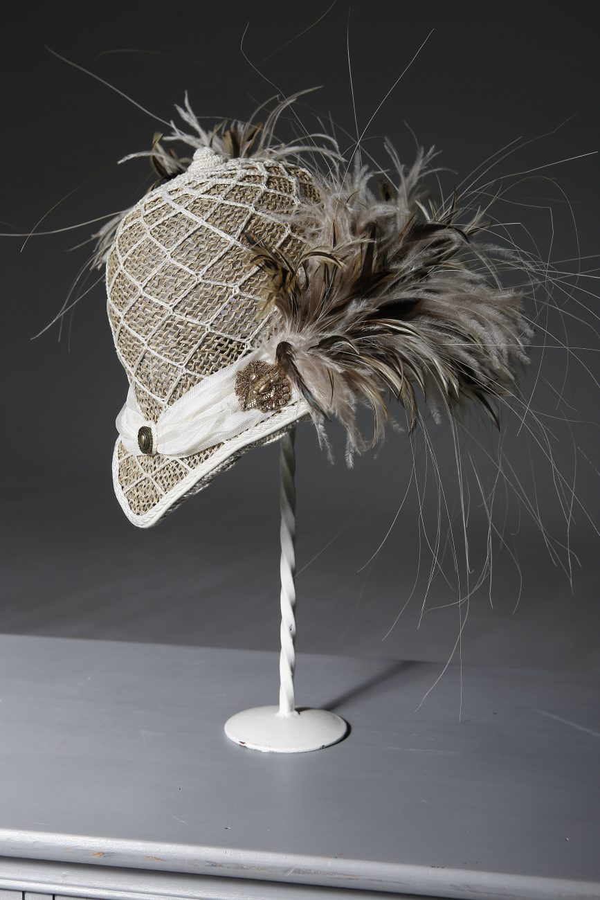 Hand-made pith hat, constructed from natural fibers covered in ecru-colored crochet, decorated with feathers and tulle. Piece created for designer Palomo Spain’s Wunderkammer Collection, presented in July 2018 in Madrid.